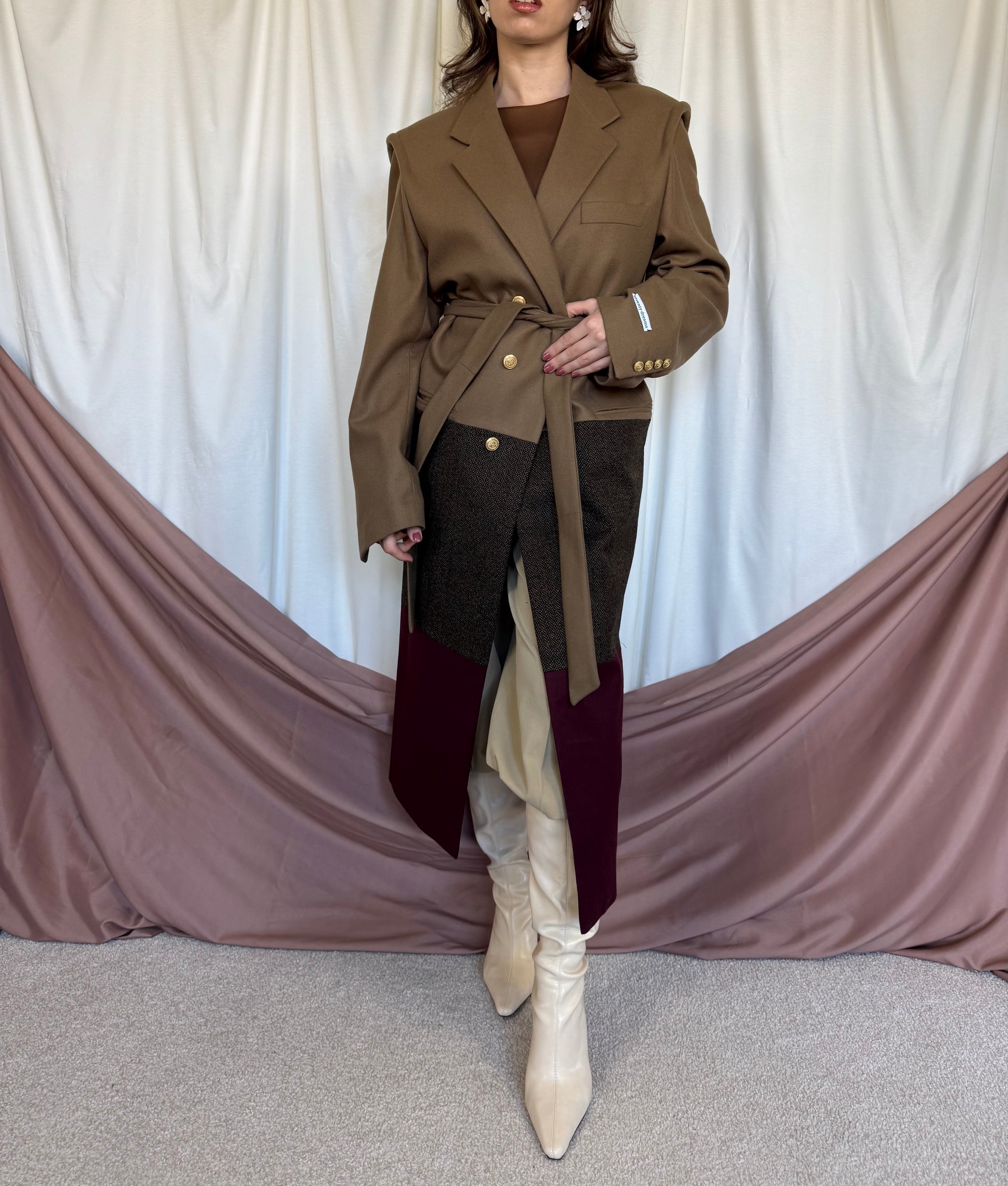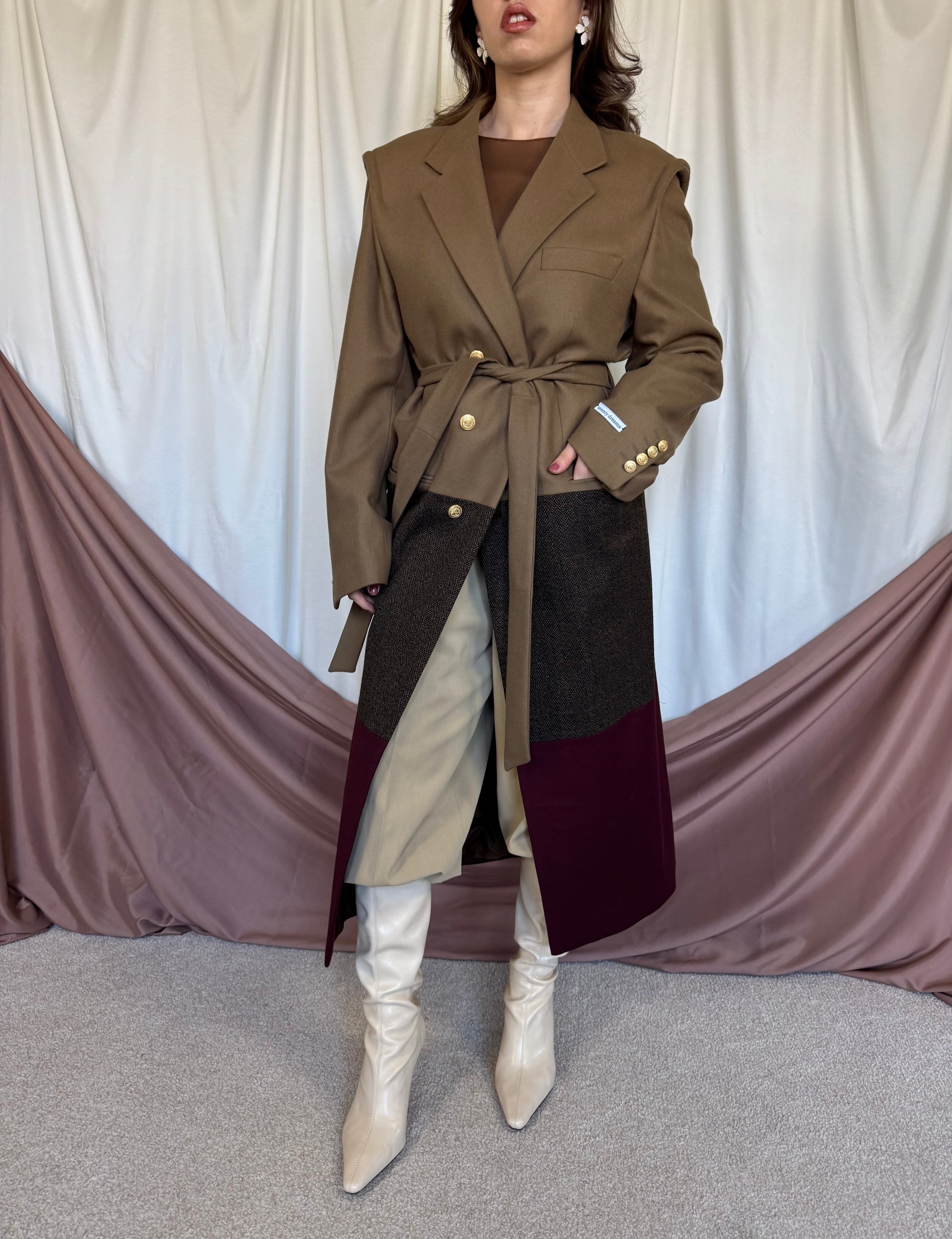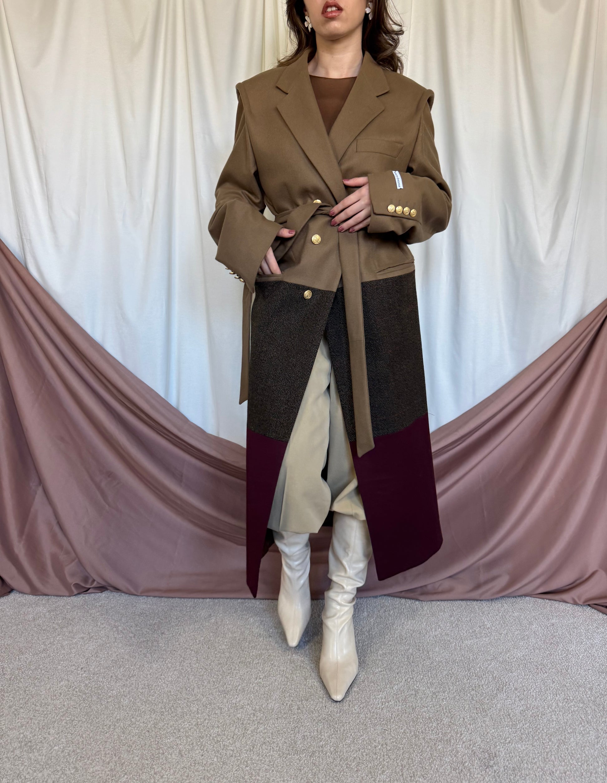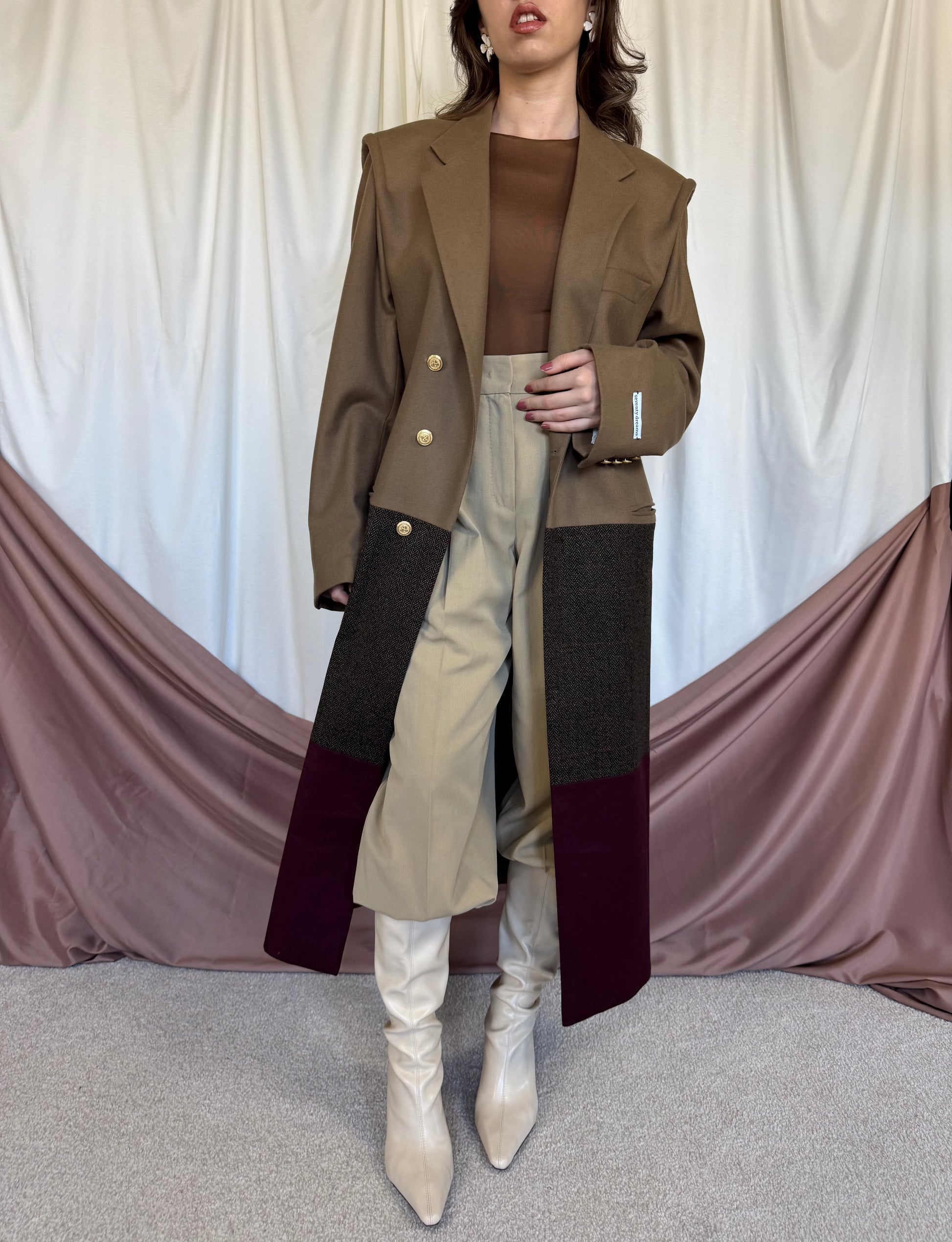 Piesă unicat realizată prin prelucrarea mai multor sacouri de brand din materiale high quality.  Fiecare articol este creat printr-un proces de upcycling: selecționăm sacouri vintage de brand din materiale premium,  le deconstruim cusatura cu cusatura, apoi reproiectăm materialul în croi nou si cool: un palton diferit, ce nu il vei vedea la nimeni altcineva. Un palton realizat la standarde italiene, de un artizan priceput si cu experienta.
