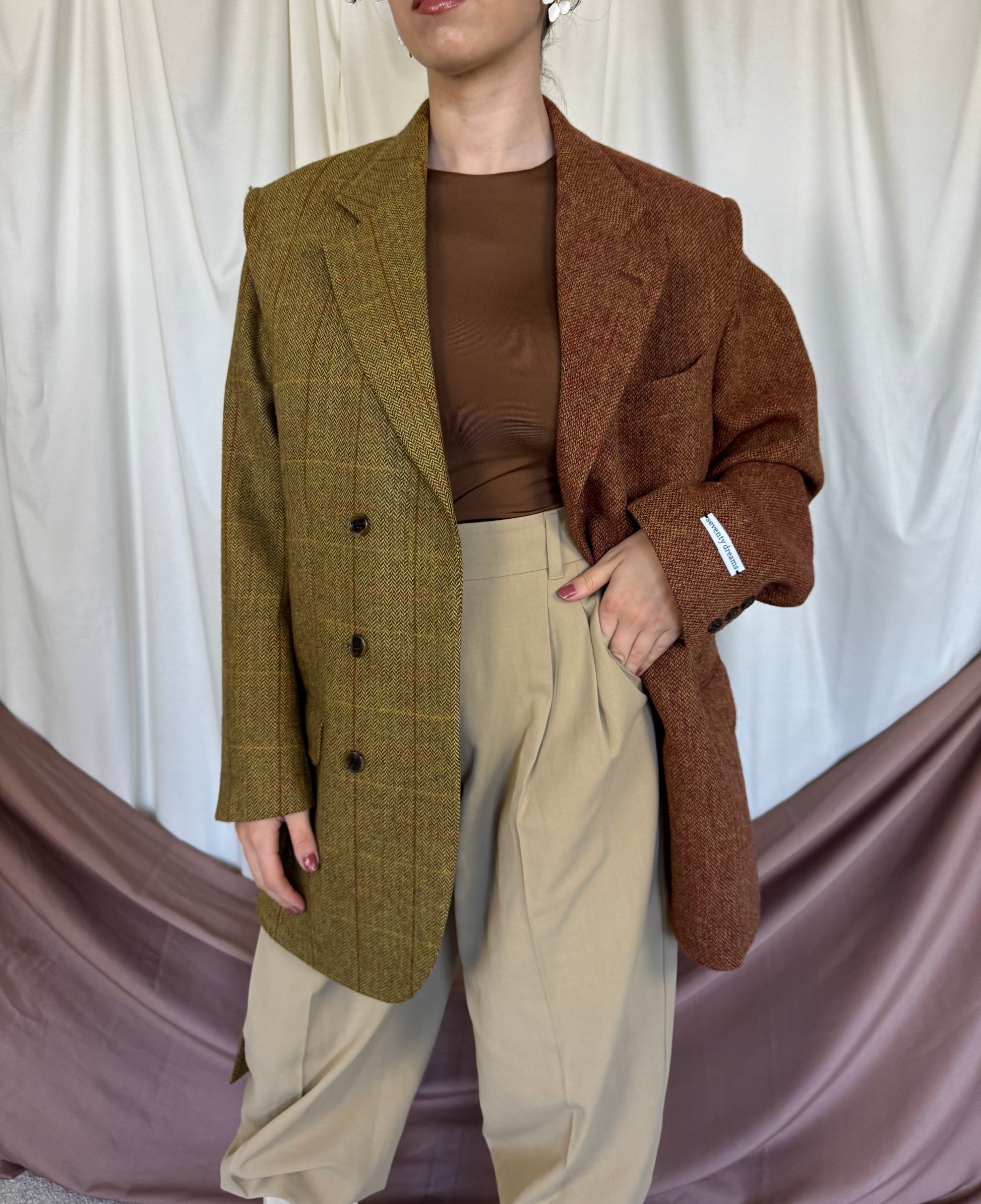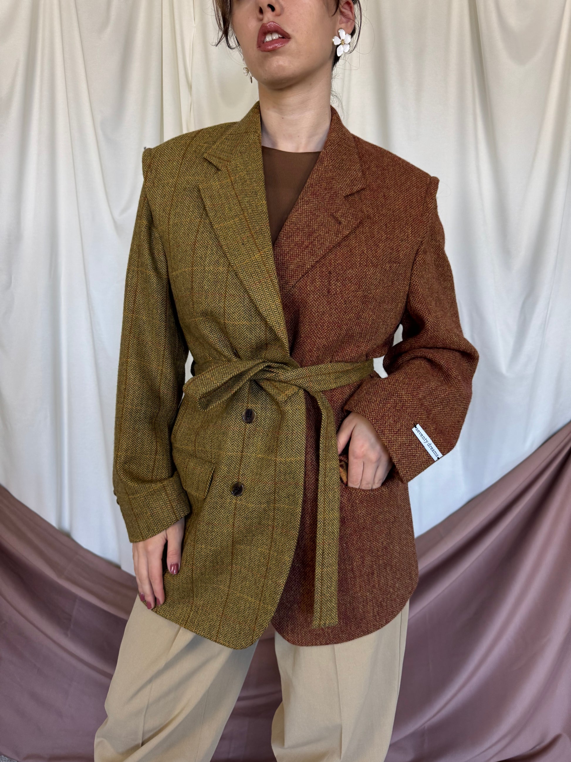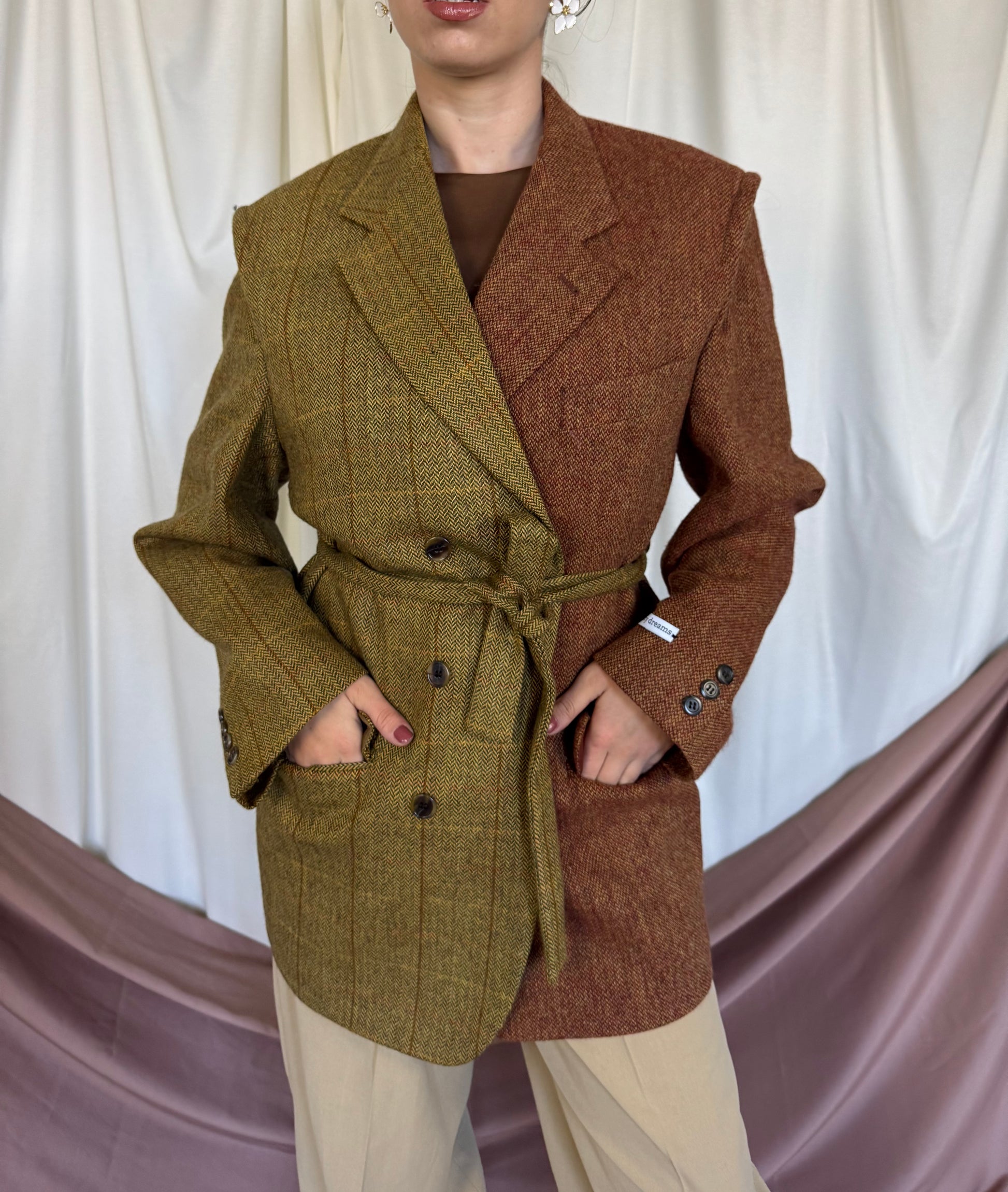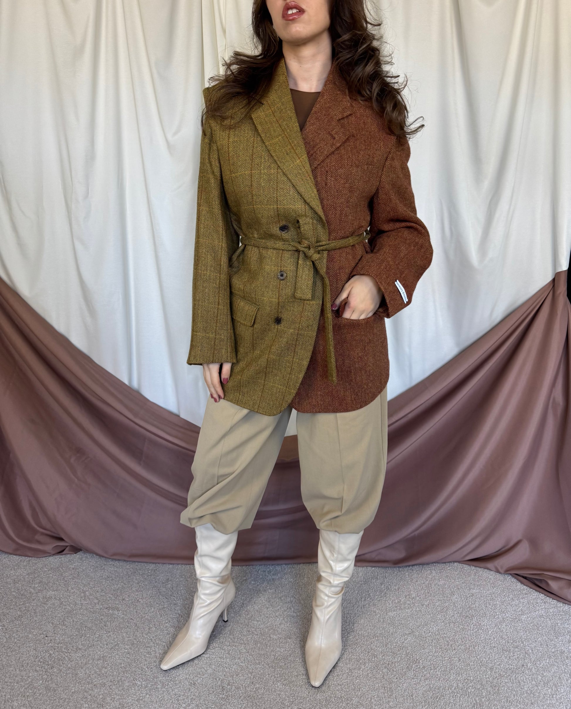 Piesă unicat realizată prin prelucrarea mai multor sacouri de brand din materiale high quality. Fiecare articol este creat printr-un proces de upcycling: selecționăm sacouri vintage de brand din materiale premium, le deconstruim cusatura cu cusatura, apoi reproiectăm materialul în croi nou si cool: un palton diferit, ce nu il vei vedea la nimeni altcineva. Un palton realizat la standarde italiene, de un artizan priceput si cu experienta.