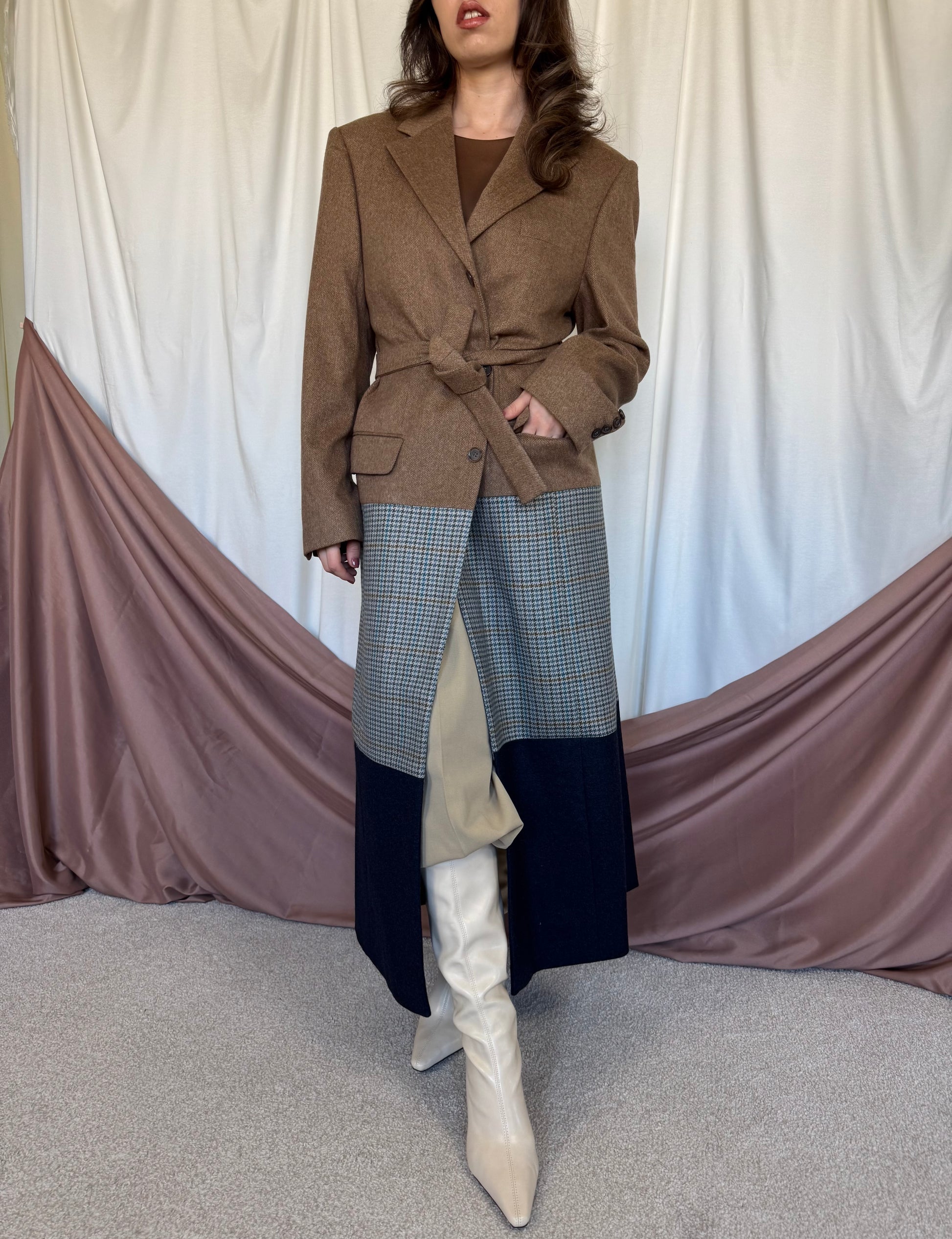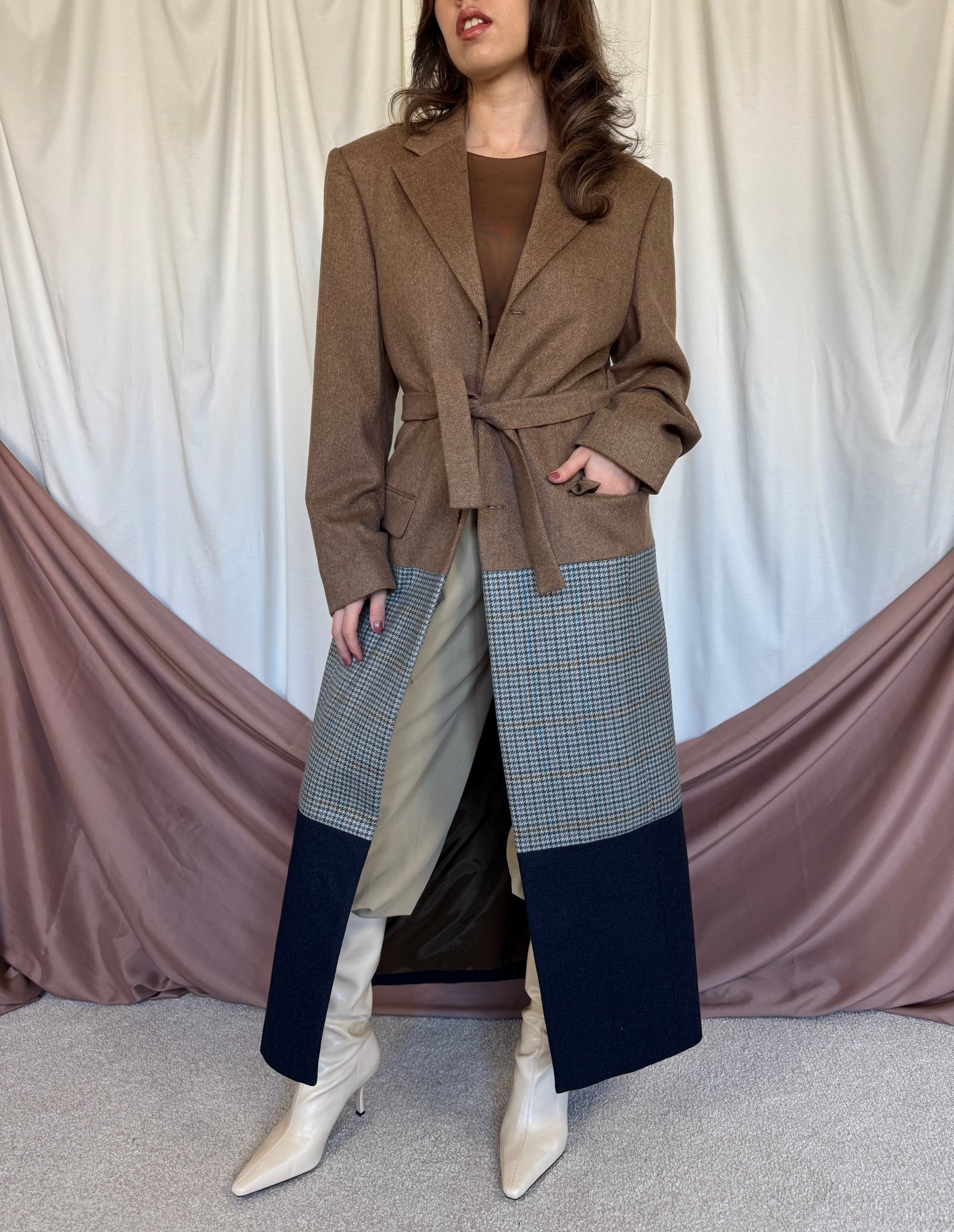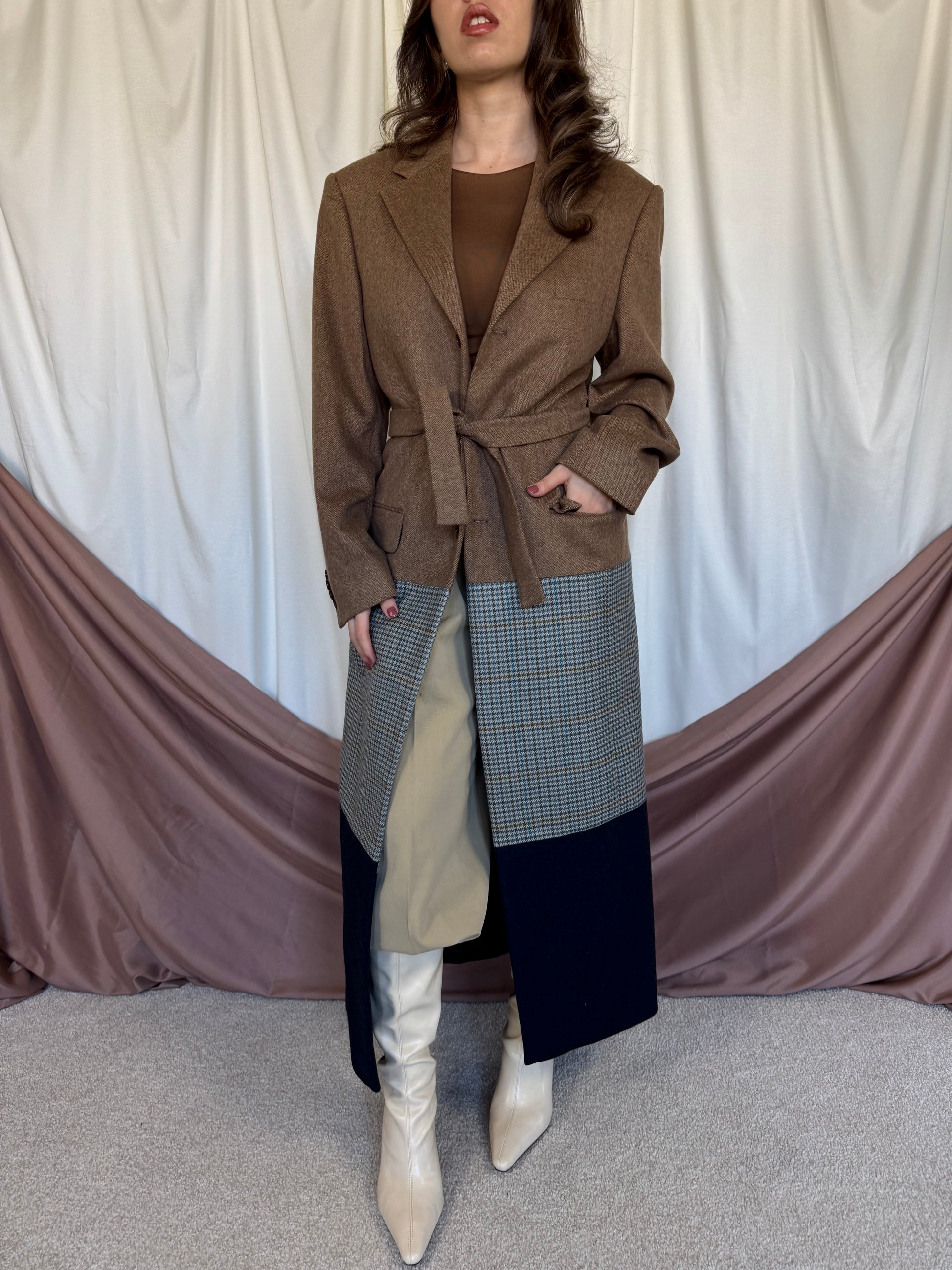 Piesă unicat realizată prin prelucrarea mai multor sacouri de brand din materiale high quality. Fiecare articol este creat printr-un proces de upcycling: selecționăm sacouri vintage de brand din materiale premium, le deconstruim cusatura cu cusatura, apoi reproiectăm materialul în croi nou si cool: un palton diferit, ce nu il vei vedea la nimeni altcineva. Un palton realizat la standarde italiene, de un artizan priceput si cu experienta.